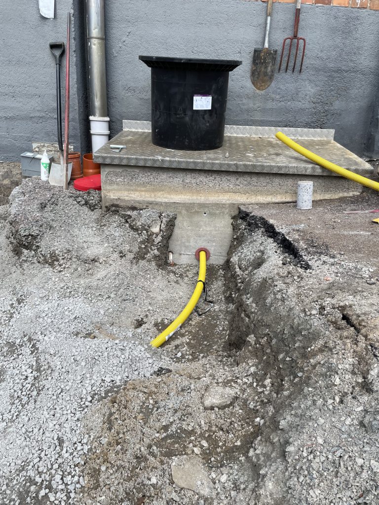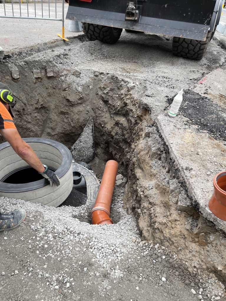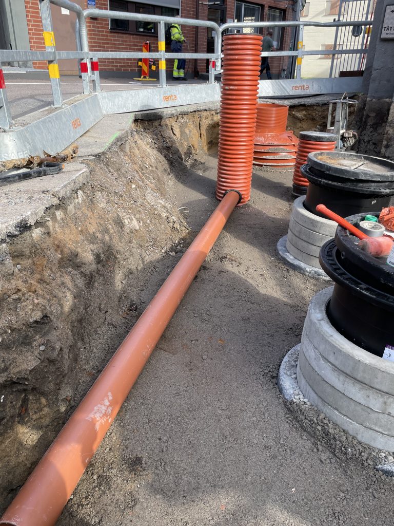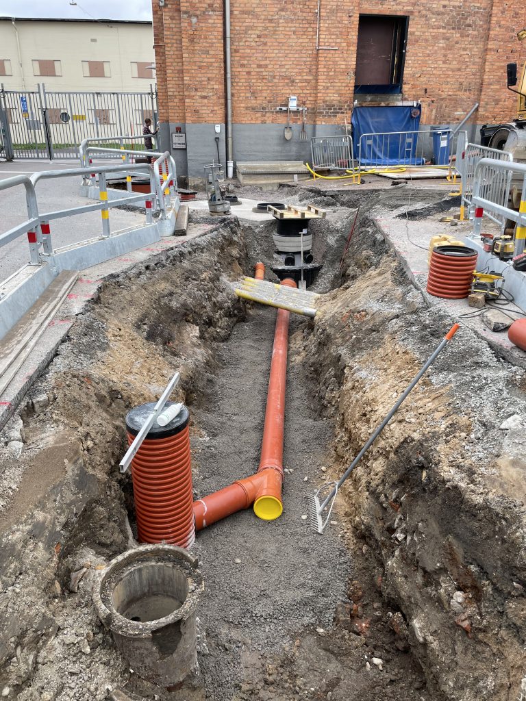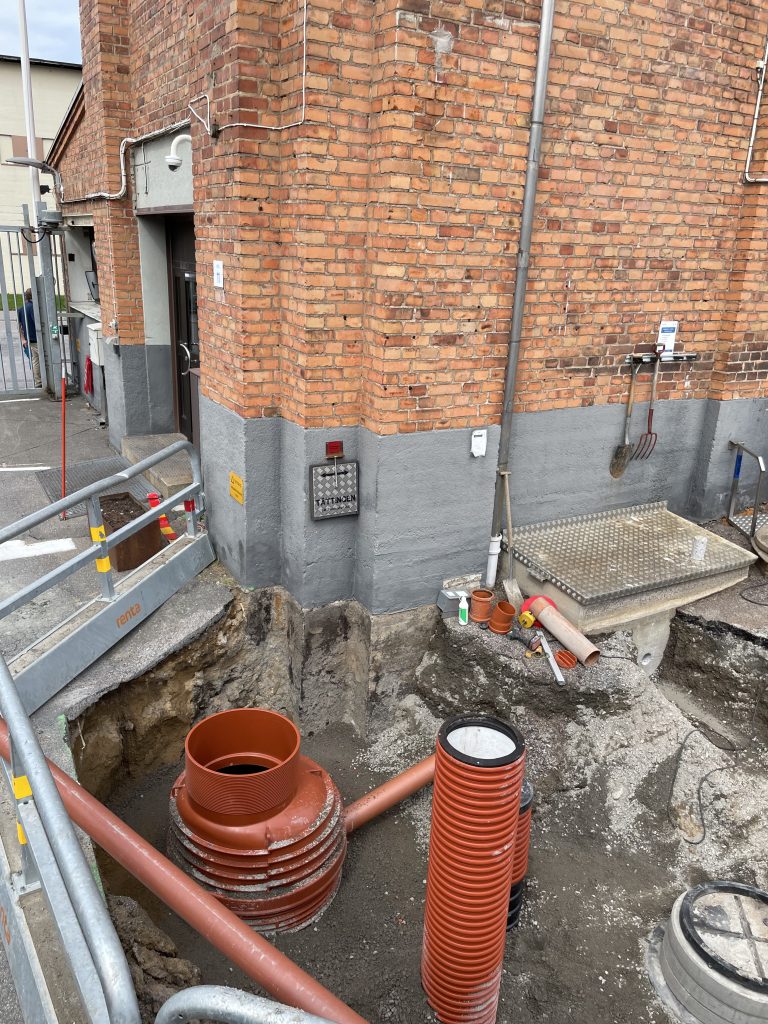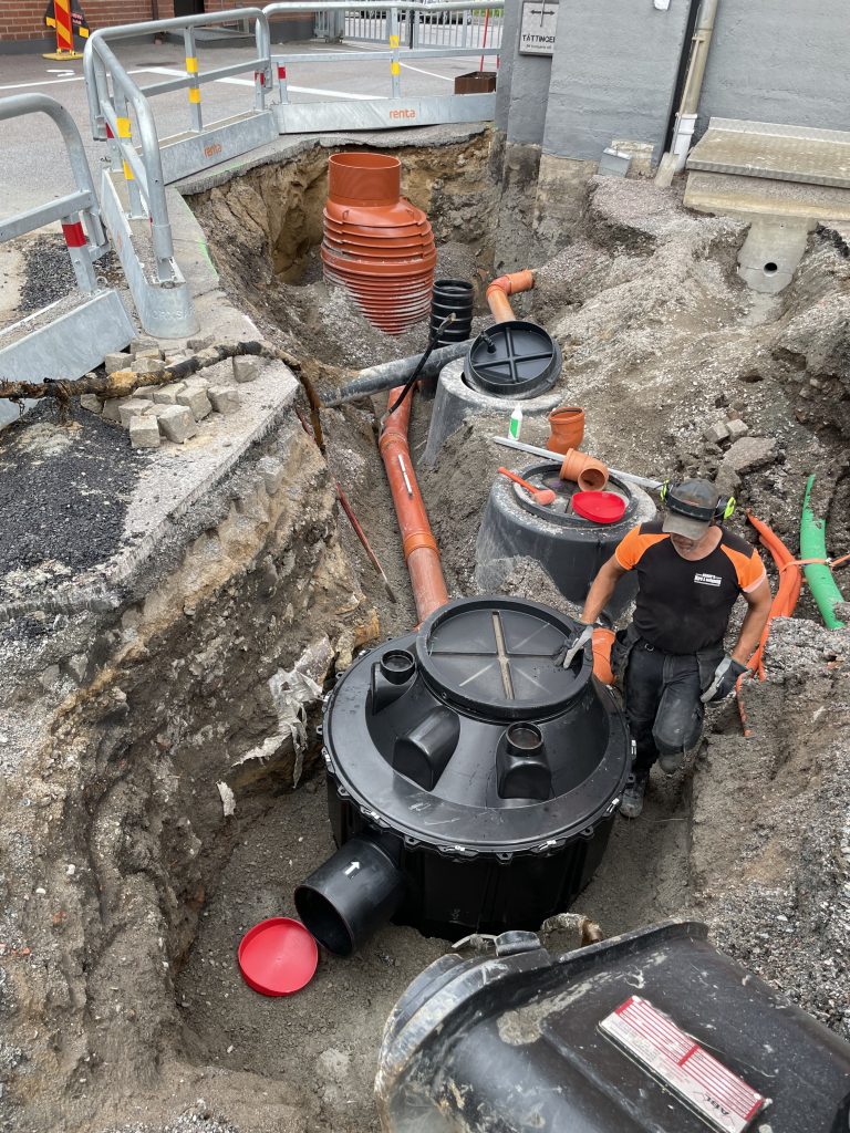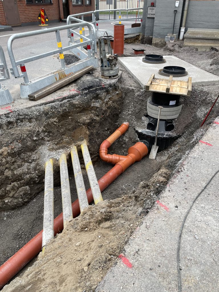 En ny oljeavskiljarbrunn och inspektionsbrunn grävdes ner på en industri där man ska kunna separera på vätskor som inte ska komma ut med dagvattnet. Inspektionsbrunn är till för att man ska kunna ha koll så kvaliteten på vattnet är okej innan det går ut i det kommunala ledningsnätet.